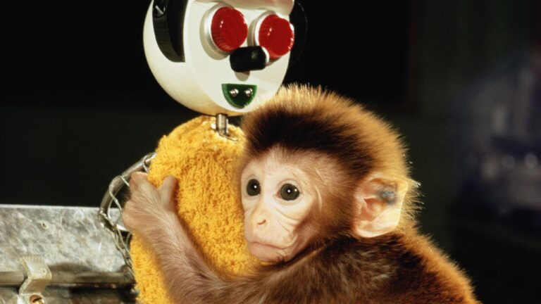 Um filhote de macaco é separado de sua mãe e colocado em uma gaiola. Lá ele encontra duas mães falsas: Uma mãe feita apenas com